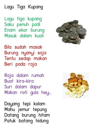 Lagu tiga kupang saku penuh padi lagu tiga kupang saku penuh padi g c enam ekor burung masuk dalam kuali c bila sudah masak. Give them to the king. Makan roti gula hey.